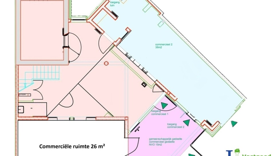 - Commerciële kantoorruimte met grote raampartij en eigen kitchenette (37m²) op de eerste verdieping.